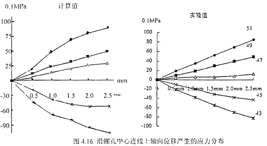 當(dāng)我們給定計(jì)算模型中三維體元上各點(diǎn)一個相同位移δ時,所得到的兩螺孔中心連線上點(diǎn)的應(yīng)力分布圖如上所示,由圖可知,計(jì)算值與實(shí)驗(yàn)值符合較好。