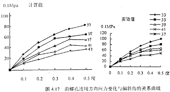 角向位移與軸向位移之力學(xué)模型的區(qū)別是角向位移時螺孔處各點(diǎn)的位移量是不相等的,也屬于幾何非線性問題,由圖可知,計(jì)算值與實(shí)驗(yàn)值是符合的,隨角向位移的增大應(yīng)力非線性增大。