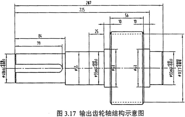 通常,實(shí)際工程結(jié)構(gòu)都是質(zhì)量、剛度和阻尼連續(xù)分布的連續(xù)系統(tǒng),其動力學(xué)特性常常用偏微分方程組描述,但由于實(shí)際結(jié)構(gòu)的幾何形狀及邊界條件復(fù)雜,難以用解析法求解偏微分方程組。于是,通常對實(shí)際工程結(jié)構(gòu)離散化,將連續(xù)分布參數(shù)系統(tǒng)簡化為具有有限多個自由度的集中參數(shù)系統(tǒng)。用矩陣表達(dá)式對每個單元進(jìn)行單元分析,根據(jù)虛位移原理建立單元的動態(tài)平衡方程式;然后,作整體分析,得到整個結(jié)構(gòu)系統(tǒng)的動力學(xué)方程式。應(yīng)用自由振動邊界條件,得到由有限元法計(jì)算整個結(jié)構(gòu)系統(tǒng)固有振動特性的基本方程。這樣,通過離散化模型,可將復(fù)雜的偏微分方程組簡化為可以求解的常微分方程組,從而使問題的求解大大簡化。如前所述,雙環(huán)減速器結(jié)構(gòu)運(yùn)動特性復(fù)雜,既有旋轉(zhuǎn)齒輪運(yùn)動,又有連桿平面運(yùn)動,根據(jù)這一具體情況,本文用集中參數(shù)法建立了該傳動系統(tǒng)的彎——扭耦合振動的動力學(xué)分析模型。對箱體建立了有限元分析模型,該有限元模型的建立是用SDRC公司的I-Deas大型集成化軟件完成,并在此基礎(chǔ)上進(jìn)行動力學(xué)響應(yīng)分析計(jì)算。當(dāng)進(jìn)行系統(tǒng)的模態(tài)計(jì)算時,為了模型建立的方便,則將齒輪輪齒部分簡化為分度圓柱,將齒輪和輪毅及輪毅與軸的緊配合聯(lián)接看成剛性聯(lián)接,忽略鍵槽、倒角和退刀槽的影響,利用自由網(wǎng)格劃分法(Free Meshing)對齒輪進(jìn)行有限元網(wǎng)格劃分。圖3.17為輸出齒輪軸的結(jié)構(gòu)示意圖,齒輪的有關(guān)參數(shù)見表2.1。物理參數(shù)為:彈性模量E=2.06×l011N/m2,泊松比為0.3, 材料密度p=7.8×103kg/m3。