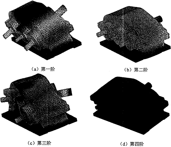 如圖3.22 所示的齒輪系統(tǒng)有限元模型,根據(jù)實(shí)際的安裝情況,為了能比較準(zhǔn)確地反映實(shí)際狀態(tài),箱體的邊界條件為:箱體底座垂直方向約束,四個螺栓孔處全部固定約束。則研究齒輪系統(tǒng)的約束模態(tài),表3.14~3.15分別為用I-Deas軟件的Lanczos模態(tài)求解法計(jì)算得到的各重要零部件及齒輪系統(tǒng)前上10階固有頻率和響應(yīng)的振型情況。限于篇幅,圖3.23給出了齒輪系統(tǒng)的前十階固有振型。