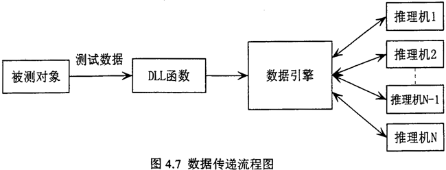 根據(jù)流程圖可知,從故障測(cè)試數(shù)據(jù)到數(shù)據(jù)引擎,有兩種數(shù)據(jù)處理方式,一種是故障測(cè)試數(shù)據(jù)由數(shù)據(jù)采集系統(tǒng)采集后,可先進(jìn)行預(yù)處理,將故障信號(hào)數(shù)據(jù)處理為推理機(jī)所需的故障特征數(shù)據(jù),然后發(fā)送出去,動(dòng)態(tài)連接庫(kù)DLL函數(shù)則通過(guò)網(wǎng)絡(luò)接收這些故障特征數(shù)據(jù),同時(shí)對(duì)照推理機(jī)向數(shù)據(jù)引擎申請(qǐng)的故障特征變量,將申請(qǐng)的故障特征變量對(duì)應(yīng)的值找出,按數(shù)據(jù)引擎規(guī)定的格式反送給申請(qǐng)數(shù)據(jù)的推理機(jī)。另一種是故障測(cè)試數(shù)據(jù)由數(shù)據(jù)采集系統(tǒng)采集后,按一定格式直接發(fā)送出去,動(dòng)態(tài)連接庫(kù)DLL函數(shù)則通過(guò)網(wǎng)絡(luò)接收這些故障信息數(shù)據(jù),然后再進(jìn)行數(shù)據(jù)預(yù)處理,將故障信息數(shù)據(jù)處理為推理機(jī)所需的故障特征數(shù)據(jù),同時(shí)對(duì)照推理機(jī)向數(shù)據(jù)引擎申請(qǐng)的故障特征變量,將申請(qǐng)的故障特征變量對(duì)應(yīng)的值找出,再按數(shù)據(jù)引擎規(guī)定的格式反送給申請(qǐng)數(shù)據(jù)的推理機(jī)。