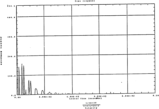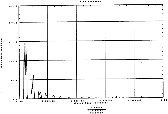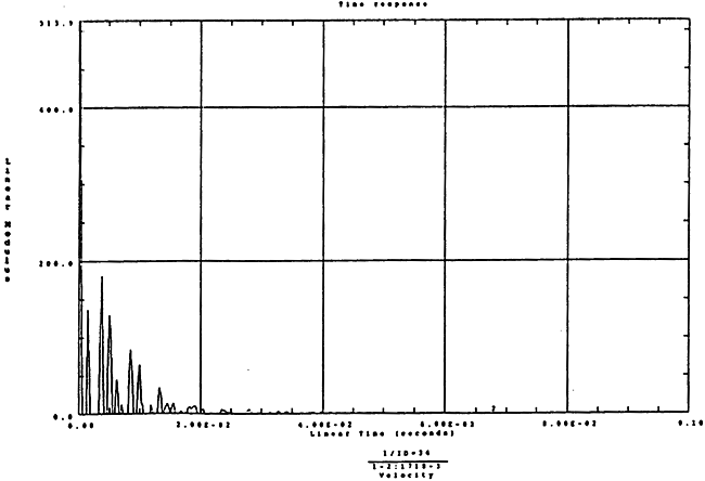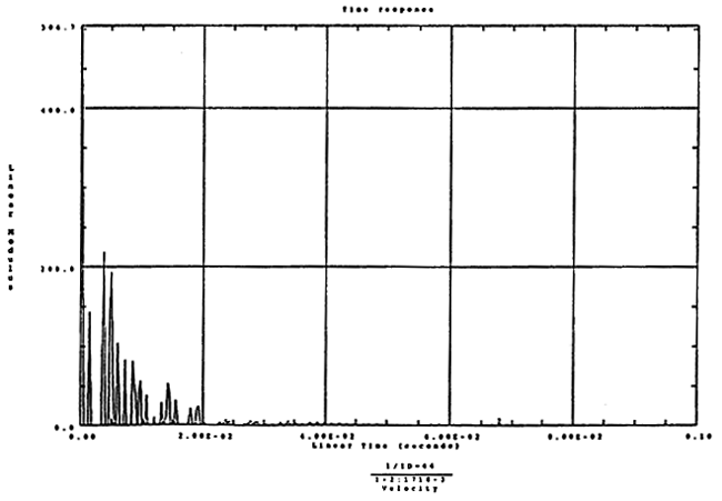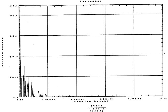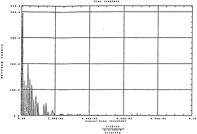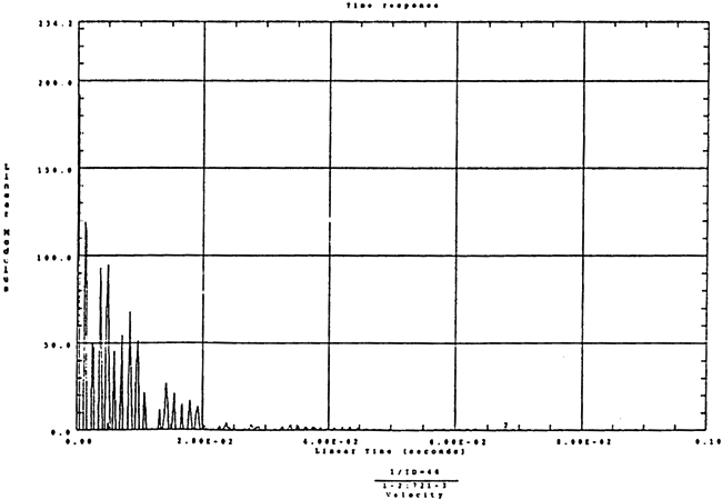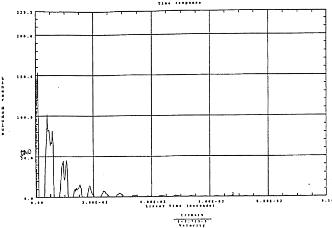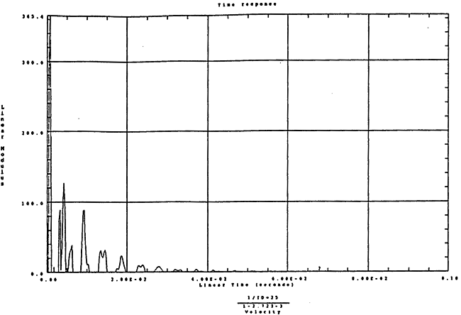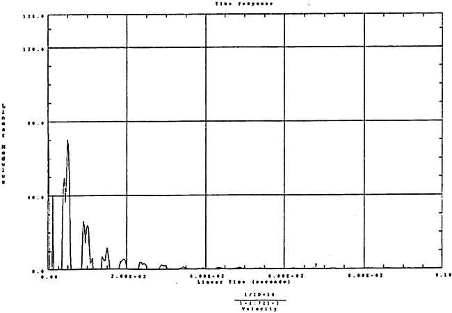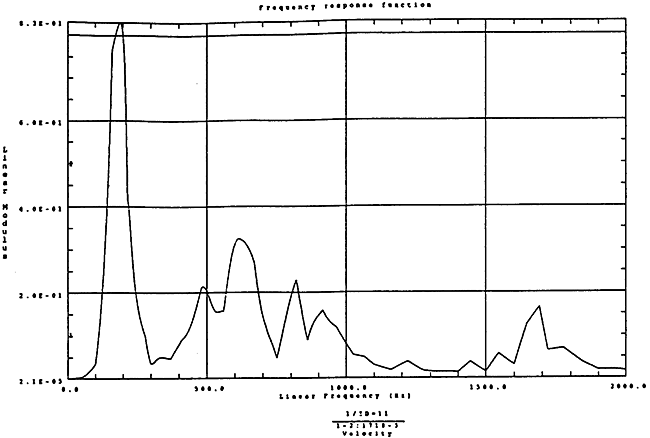 在如圖4-14的1000rm-400kgm工況下的載荷譜的激勵(lì)作用下,SHQ40振動(dòng)系統(tǒng)測(cè)點(diǎn)2、5、8Z向的振動(dòng)速度的幅值函數(shù)如圖5-19、圖5-20和圖5-21所錄,圖5-22、圖5-23和圖5-24為其相應(yīng)的時(shí)域皮形。振動(dòng)速度的預(yù)估值與試驗(yàn)的實(shí)測(cè)值(如表6-13)對(duì)比見表5-1所示的工況四。