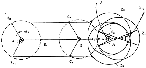 如圖7-1示,三環(huán)減速器三套平面四桿機構AB1C1D-01、AB2C2D2-02、AB3C3O3及外齒輪見圖中所示。在圖示位置時,平面四桿機構AB1C1D處理死點位置,運動處于不確定運動狀態(tài),由于嚙合力的作用將產(chǎn)和瞬間的沖擊力。為了能除去或減少該沖擊力的作用,我們在一定的角度θ內(nèi)對AB1C1D上的內(nèi)齒輪進行修形,使在死點位置時,平面四桿機構AB1C1D不受嚙合力或少受嚙合力作用,這樣,通過其余兩套平面四桿機構就能較易將其速成過死點位置,從而達到減不止或消除過死點的沖擊。同樣,對另兩套平面四桿機構AB2C2D2及AB3C3O3作同樣的修形。這種方法我們已正在試驗過程中。