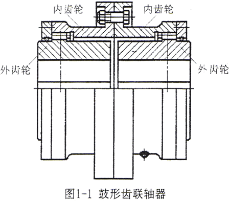 鼓形齒聯(lián)軸器(結(jié)構(gòu)如圖1-1所示)是機(jī)械傳動的重要基礎(chǔ)部件,它是在直齒齒輪聯(lián)軸器基礎(chǔ)上為滿足大傾角、變化傾角、大傳遞轉(zhuǎn)矩、小尺寸、高可靠性等要求發(fā)展起來的。它已在冶金、采礦、化工、起重運(yùn)輸?shù)葯C(jī)械設(shè)備中廣泛應(yīng)用[65-67]。尤其是在冶金設(shè)備中更是大量采用。如武鋼引進(jìn)的一米七軋機(jī)系統(tǒng)中裝機(jī)量達(dá)2500套。國際上一些工業(yè)發(fā)達(dá)國家五十年代就有鼓形齒聯(lián)軸器的應(yīng)用。我國近十幾年來從國外引進(jìn)的成套和單機(jī)設(shè)備中大量采用了鼓形齒聯(lián)軸器。國內(nèi)雖在六十年代開始在軋機(jī)主傳動上應(yīng)用了鼓形齒聯(lián)軸器,但是設(shè)計制造技術(shù)落后,沒有廣泛推廣應(yīng)用。近十幾年來,國內(nèi)一些廠家為了滿足從國外引進(jìn)設(shè)備的鼓形齒聯(lián)軸器的進(jìn)口設(shè)備備件需要,通過消化吸收引進(jìn)技術(shù),進(jìn)行批量仿制鼓形齒聯(lián)軸器,同時進(jìn)行較深入的機(jī)理研究[69-79]。但未建立一套自己的完整合理的設(shè)計方法,制造技術(shù)也較落后。