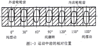 鼓形齒聯(lián)軸器的運(yùn)動狀態(tài)是復(fù)雜的空間運(yùn)動,F(xiàn)有資料均把它簡化為展開的平面運(yùn)動進(jìn)行分析,在有軸間傾角的狀態(tài)下,將運(yùn)動分為齒的擺動運(yùn)動和翻轉(zhuǎn)運(yùn)動。這兩種運(yùn)動在嚙合半周中經(jīng)歷純擺動—復(fù)合運(yùn)動—純翻轉(zhuǎn)—復(fù)合運(yùn)動—純擺動的循環(huán)運(yùn)動過程,如圖1-3所示。純擺動—純翻轉(zhuǎn)的相位差為90°。在非純擺動和純翻轉(zhuǎn)運(yùn)動過程中,內(nèi)外齒的相對運(yùn)動是擺動運(yùn)動和翻轉(zhuǎn)運(yùn)動的復(fù)合運(yùn)動[68]。顯然這種簡化分析方法是很粗略的,無法確切地描述空間嚙合狀態(tài),但是它對于分析齒向位移、棱邊卡死現(xiàn)象及說明某一輪齒所處周向位置是有意義的。