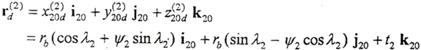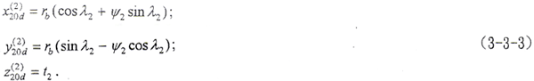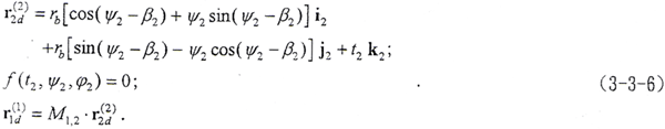 式中 ψ2、t2——曲面參變量;rb——漸開線基圓半徑。設(shè)α2為曲面某一點(diǎn)K處的壓力角,則有ψ2=tgα2。將(3-3-2)式轉(zhuǎn)換到S20坐標(biāo)系,方程為