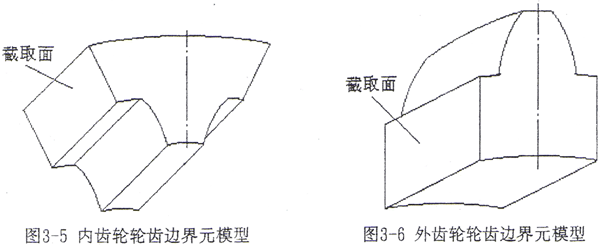 設(shè)內(nèi)齒輪為主動輪,將一輪齒從左右齒槽中點(diǎn)到輪體外圓以軸截面取出,如圖3-5所示。在輪體截取面上作用均布力,其約束為繞齒輪軸線轉(zhuǎn)動而不能有軸向位移。外齒為從動輪,將一輪齒從左右齒槽中點(diǎn)到齒輪內(nèi)孔以平行于輪齒中線和齒輪軸線的平面取出,如圖3-6所示。截面上的面力為未知,其約束為各方向位移為零。