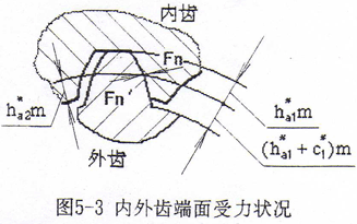 一般鼓形齒聯(lián)軸器的齒頂高系數(shù)ha1*=1,徑向間隙系數(shù)c1*=0.25,全齒高h=2.25m,采用標準齒輪,其內(nèi)外齒輪分度圓齒厚大致相等。它的主要優(yōu)點是內(nèi)外齒輪加工工藝性好,可采用標準齒輪滾刀和插齒刀進行加工,且尺寸計算簡單。但是這種鼓形齒聯(lián)軸器的外齒輪齒根抗彎強度比內(nèi)齒輪齒根抗彎強度要低,即內(nèi)齒輪齒根彎曲強度有富余。因此,可設法增加外齒輪齒厚,提高外齒輪齒根彎曲強度。通常采用兩種方法:一是采用特殊刀具減簿內(nèi)齒輪齒厚而增加外齒輪齒厚,使內(nèi)外齒輪的抗彎強度接近一致;另一種方法是采用變位短厚齒型內(nèi)外齒輪,降低外齒輪齒高,加大外齒輪齒厚,使其粗短,以提高外齒輪的抗彎強度[75]。前一種方法需采用專用的瘦齒型滾刀,這給加工帶來不少麻煩,因此在國內(nèi)不宜推廣。文獻[75]所出了一種變位短厚齒型鼓形齒聯(lián)軸器的設計制造方法,由于是采用標準滾刀和插齒刀進行加工,加工方法簡單易行,因此工藝性好,生產(chǎn)效率高,是一種較理想的適宜推廣應用的設計加工方法。但是,該文提出采用齒頂高系數(shù)ha1*=0.8不一定合理,因為齒頂高系數(shù)的確定一方面要使內(nèi)外齒輪齒根彎曲強度一致,另一方面又要使內(nèi)外齒輪齒面具有足夠的接觸強度及內(nèi)齒輪齒頂厚應大于0.25m。因此必須建立優(yōu)化數(shù)學模型進行計算來確定。將內(nèi)外齒輪輪齒簡化成懸臂梁受力(如圖5-3所示)[127],本問題是要使內(nèi)外齒輪齒根有接近的齒根彎曲強度,則目標函數(shù)為