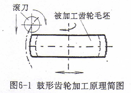 普通滾齒機具有主切削運動傳動鏈、分齒運動傳動鏈、進給運動傳動鏈和差動運動傳動鏈,通過調(diào)整,能夠滿足圓柱齒輪和蝸輪的加工要求。本改造的內(nèi)容是要使其能夠滿足特定鼓度曲線的鼓形齒輪的加工要求,即在鼓形齒輪一定的軸向位置有一定的徑向變位,這就需要增加一個加工運動的自由度。加工原理如圖6-1所示。