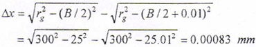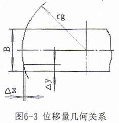 位移傳感器根據(jù)運動的型式不同分為直線位移傳感器和角度位移傳感器,直線位移傳感器常見的有光柵位移傳感器、感應(yīng)同步傳感器等,它們可以直接安裝在所測直線運動部件上,無傳動誤差影響,精度高。但是由于結(jié)構(gòu)的原因,它們需要非常精確的安裝基準和合適的安裝空間,且通常情況下安裝定位較困難。由于光柵的密封性較差,光柵材料較脆弱,所以它們的抗污染性能和抗振性能也較差,而且所需防護裝置也較復(fù)雜,成本較高。角度位移傳感器最常用的有光電編碼器,它具有精度高,體積小,安裝方便、密封性好、抗污染和抗振性能好等優(yōu)點。本設(shè)計需測刀架的位移,在刀架上,切削冷卻潤滑油、切屑及粉塵的飛濺較嚴重,且不易設(shè)置防護裝置。如果采用光電編碼器需通過檢測絲桿的角位移間接檢測刀架的直線位移,但絲桿及傳動機構(gòu)具有的傳動精度和位移檢測精度是足夠的。另外,加工鼓形齒輪時,形成鼓度曲線的實際切削位置通常在曲線較陡的范圍,例如加工圓弧鼓度曲線,幾何關(guān)系見圖6-3,設(shè)位移圓半徑rg=300mm,齒寬B=50mm,當Δy=0.01mm,則