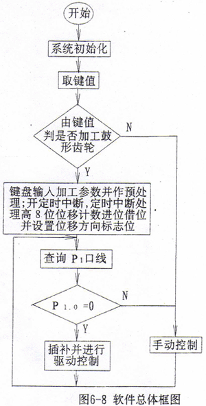 本系統(tǒng)的軟件采用模塊化設(shè)計,主要包括系統(tǒng)初始化、數(shù)據(jù)輸入和顯示、插補運算和驅(qū)動控制、定時中斷處理位移信號、自動與手動控制等功能模塊。軟件總體框圖如圖6-8所示。