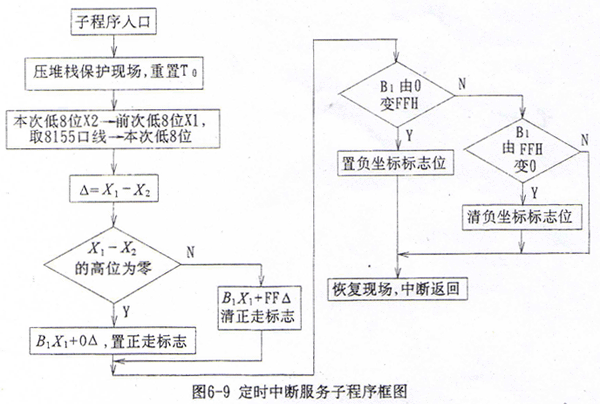 位移脈沖計數(shù)的高8位的處理采用差值法,設(shè)前后兩次的低8位二進制數(shù)為X1、X2,高8位二進制數(shù)為B1、B2,先求差值△=X2-X1,若△的最高位為1,則此時整個16位計數(shù)的十六進制數(shù)為B1X1+FF△;若△的最高位為0,則為B1X1+0△。相應(yīng)的,若△的最高位為1時,當前刀架向Y坐標負方向運動;若△的最高位為0時,當前刀架向Y坐標正方向運動。而高8位由FFH變?yōu)?0H時,當前刀架位置在Y坐標大于零;高8位由00H變?yōu)镕FH時,當前刀架位置在Y坐標小于零,此時應(yīng)取Y坐標補碼進行插補運算。定時中斷服務(wù)子程序框圖見圖6-9。