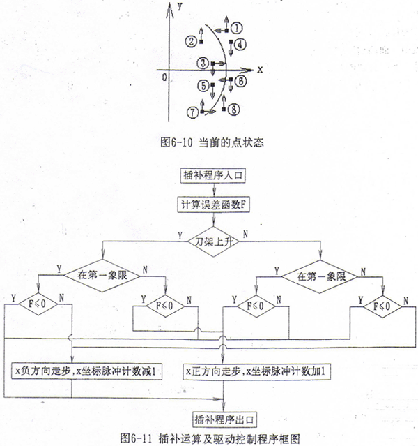 非圓弧曲線插補運算時,首先根據(jù)當前的Y坐標值及插補曲線f(x,y)=0,求解出x坐標理論值xt,設(shè)當前的實際x坐標為xr,令誤差函數(shù)F=xr-xt。對圓弧曲線,根據(jù)當前的x、y坐標,計算x2+y2值,令誤差函數(shù)F=x2+y2-R2。根據(jù)當前點在不同象限、當前刀架的運動方向及誤差函數(shù)的正負,共有8種情況出現(xiàn)(如圖6-10所示),應(yīng)根據(jù)它們的狀態(tài)進行不同的處理。①、⑥兩種情況應(yīng)使當前點向x坐標負方向走步;③、⑦兩種情況應(yīng)使當前點向x坐標正方向走步;②、④、⑤、⑧四種情況無需在x坐標方向走步。由于在切齒過程中刀架的進給速度較低,最高一般不超過30毫米/分鐘,兩次y坐標計數(shù)脈沖間隔時間可達幾十毫秒,而插補運算的時間不超過1毫秒,因此插補速度足夠。在刀架快速運動時,插補有滯后,但此時不切削,這種滯后不影響加工。在插補過程中,顯示器輪流顯示當前的x、y坐標值,以利于操作者監(jiān)視加工情況,因此還需進行顯示BCD碼的轉(zhuǎn)換和輪換的控制。插補運算及驅(qū)動控制程序框圖見圖6-11。