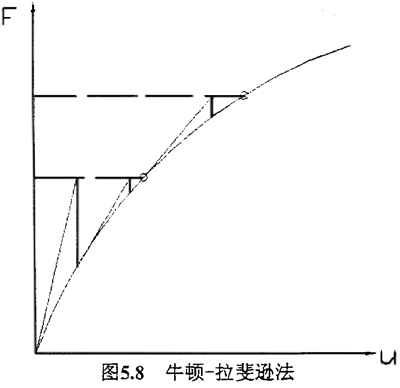 ANSYS程序應(yīng)用NR(牛頓-拉斐遜)法來求解非線性問題.在這種方法中,載荷分成一系列的載荷增量.載荷增量施加在幾個載荷步.圖5.8說明了非線性分析中的完全牛頓-拉斐遜迭代求法,共有2個載荷增量。