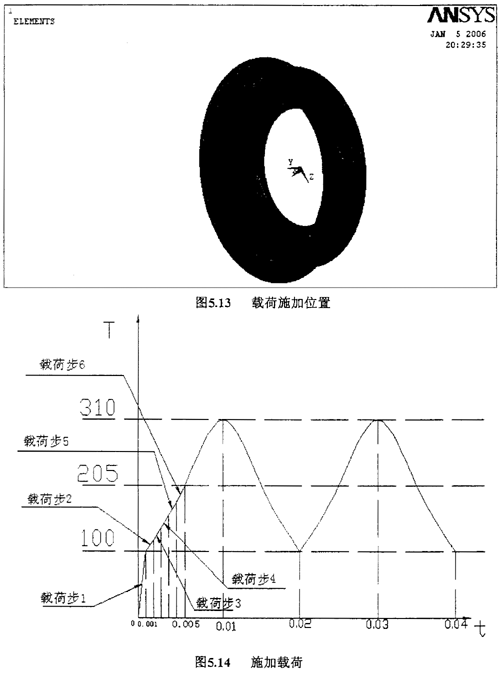 在小鐵圈端施加205-105cis314t的動載荷,為了能夠清楚地看到動態(tài)變化的過程,我們?nèi)蓚周期。在0.001秒施加第一個載荷,T1=100,迅速達(dá)到電動機(jī)工作狀態(tài)。對于正紡載荷,將每四分之一周期劃分成五小段,每一個小段作為1個載荷步,一共可分為20個載荷步。載荷點(diǎn)和施加過程如圖5.13和圖5.14所示: