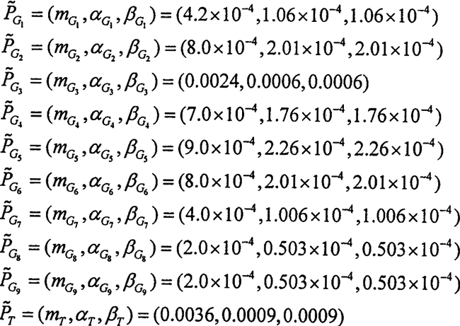 據(jù)式(3-20)及表3-3中所列的真值函數(shù)形式,計算可得各中間事件及頂事件發(fā)生概率的模糊數(shù)為: