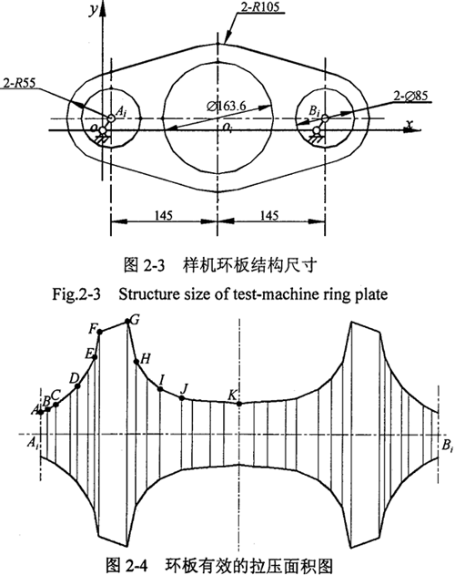 三環(huán)減速機運動屬靜不定問題,用一般平面剛體力學方法無法完全求出機構的作用力,影響到三環(huán)減速器設計和傳動性能的改進。為此需要考慮各構件的變形,建立能充分反映三環(huán)減速器實際受力的變形協(xié)調條件作為補充方程。三環(huán)減速機傳動機構是雙曲柄連桿機構,曲柄的旋轉半徑是偏心軸的偏心距,曲柄布置在由支撐軸承支承的偏心軸上,環(huán)板是雙曲柄機構的連桿,傳動過程中的主要變形有各構件的接觸變形、軸的扭轉彎曲變形、環(huán)板的拉壓變形等等。根據(jù)位移變形分析可知,軸的彎曲變形和環(huán)板的拉壓變形是主要的變形形式。對于筆者設計的如圖2-3所示的環(huán)板,設A為輸入軸,B為輸出軸。為了計算上的方便,以前將其簡化為等截面桿處理。實際上,由于有效截面的最大面積是最小截面面積的5倍多,這種簡單地處理和實際有較大的差別。環(huán)板受拉壓變形時的有效拉壓面積的形狀如圖2-4所示(單位:mm)。