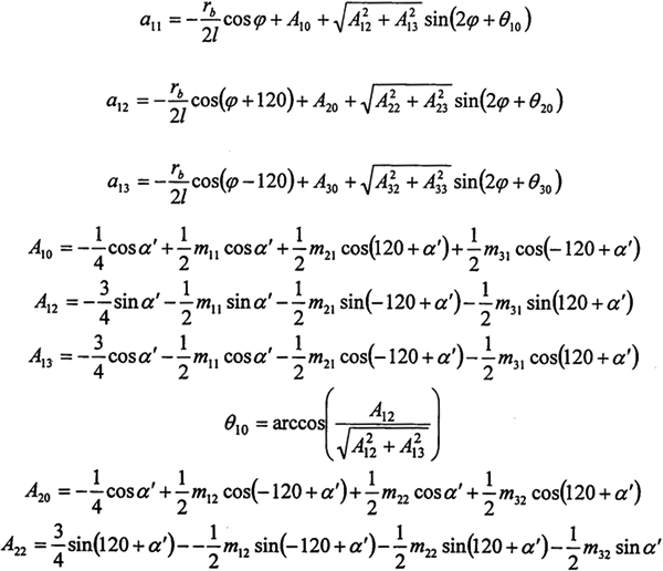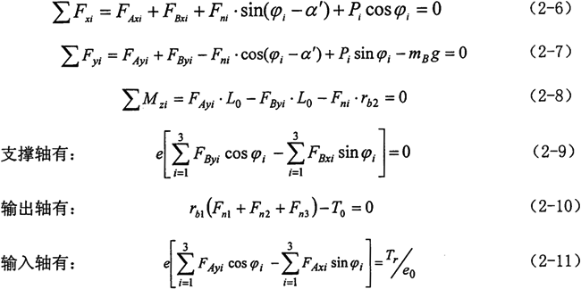 由上式可看出,任意時刻各環(huán)板上作用的嚙合力是不相等的,且是與轉角、環(huán)板和曲柄軸結構尺寸、壓力角以及偏心尺寸有關的復雜函數(shù),假設各嚙合力相等或者是成一簡單的函數(shù)關系都是與實際嚴格不符的。若需要用簡潔的函數(shù)關系加以描述,應首先利用上式求出輸出軸旋轉一周時的數(shù)個嚙合力的表達式,這里不作詳細的討論。