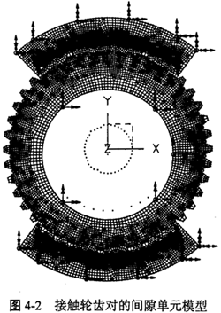 重慶大學(xué)機(jī)械傳動(dòng)國家重點(diǎn)實(shí)驗(yàn)室對(duì)三環(huán)減速器的內(nèi)齒環(huán)板所做的應(yīng)力分析以及對(duì)少齒差內(nèi)嚙合齒輪輪齒接觸問題研究均表明,三環(huán)減速器是多齒嚙合的。根據(jù)有關(guān)理論,筆者所在的課題組對(duì)完全平衡三環(huán)減速器的輪齒應(yīng)力和多齒嚙合問題進(jìn)行了理論計(jì)算和實(shí)驗(yàn)研究,結(jié)果表明,三環(huán)傳動(dòng)由于嚙合過程中的輪齒受力變形形成了多齒接觸,各齒上的載荷分布近似0°~180°間的正弦關(guān)系。圖4-2所示是接觸輪齒對(duì)的間隙單元模型。