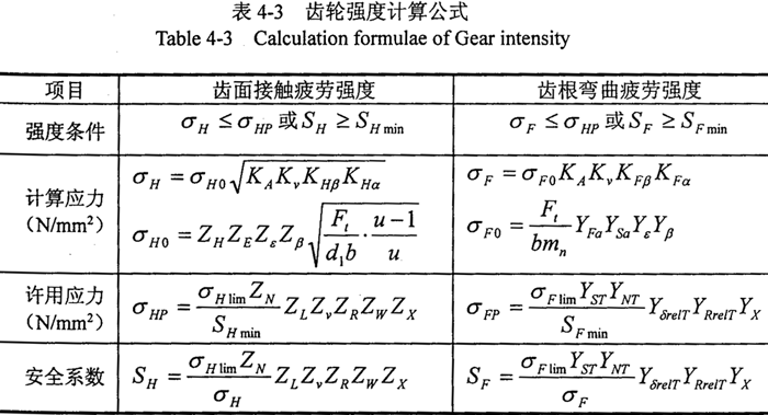 查現(xiàn)代機(jī)械傳動(dòng)手冊(cè)選SHmin=1.5和SFmin=1.5。由于樣機(jī)的內(nèi)齒環(huán)板和輸出外齒輪均選用45號(hào)鋼調(diào)質(zhì)處理,根據(jù)上表提供的有關(guān)公式和樣機(jī)的實(shí)際結(jié)構(gòu)和工況,確定有關(guān)系數(shù)后,通過計(jì)算有表4-4所示的計(jì)算結(jié)果。