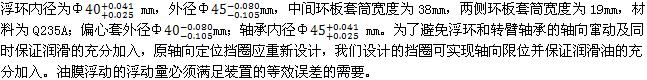 浮環(huán)是油膜浮動均載裝置的關(guān)鍵件之一,工作時(shí)它既要承受較大的載荷,又要具有一定的抗磨和抗蝕性。同時(shí)還應(yīng)具有良好的切削加工性能。筆者設(shè)計(jì)的在曲柄軸偏心套與轉(zhuǎn)臂軸承內(nèi)圈之間加一能自由轉(zhuǎn)動的金屬浮動環(huán)的方案,工作時(shí),轉(zhuǎn)臂軸承與浮環(huán)之間、浮環(huán)與偏心套之間各形成一層油膜,共有兩層共轉(zhuǎn)滑動軸承油膜。下面以中間環(huán)板轉(zhuǎn)臂軸承處的油膜浮動均載裝置為例對兩層油膜的均載裝置的油膜間隙進(jìn)行分析設(shè)計(jì)。樣機(jī)的主要技術(shù)數(shù)據(jù)見表4-2和 4-3。下面根據(jù)第二章的受力分析和第三章的油膜浮動均載的有關(guān)公式對油膜浮動均載機(jī)構(gòu)形成的雙層厚油膜進(jìn)行設(shè)計(jì)。內(nèi)層油膜的設(shè)計(jì)見表4-6。