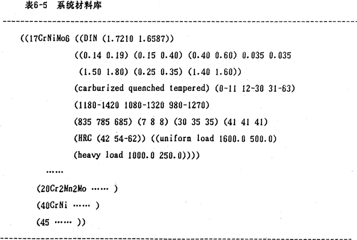 軸、箱體以及對大型組裝具輪采用的支撐部分的材料的選擇方法類同于齒輪材料,在此不詳細(xì)討論。若當(dāng)前材料數(shù)據(jù)庫無可供選擇的材料時,系統(tǒng)便要求用戶輸入指定的材料特性,并按相應(yīng)的格式加入到材料數(shù)據(jù)庫,以便不斷地完善系統(tǒng)的材料庫。