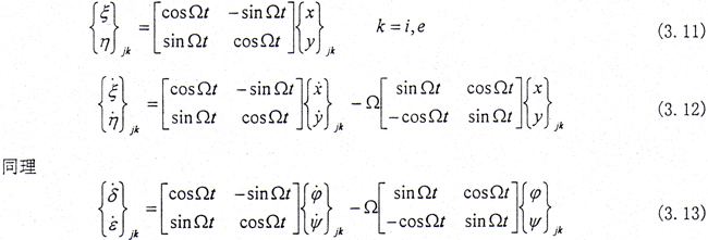 設(shè)將整個(gè)軸承—轉(zhuǎn)子—齒輪聯(lián)軸器系統(tǒng)劃分成n個(gè)軸段和n個(gè)結(jié)點(diǎn),在第j個(gè)結(jié)點(diǎn)處存在一個(gè)半齒輪聯(lián)軸器系統(tǒng),如圖3.1所示。將外齒輪和內(nèi)齒套均看作一當(dāng)量圓盤,并滿足小擾動(dòng)假設(shè),不計(jì)軸向運(yùn)動(dòng),則圓盤的運(yùn)動(dòng)可用其中心的位移(xj,yj)和相應(yīng)的偏轉(zhuǎn)角(φj,ψj,θj)來表示,其中三個(gè)偏轉(zhuǎn)角的意義見圖3.2。設(shè)oxyz為固定坐標(biāo)系,oξηz為相應(yīng)的旋轉(zhuǎn)坐標(biāo)系,下面就以此為模型用拉格朗日方程來建立該子系統(tǒng)的運(yùn)動(dòng)微分方程。