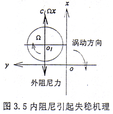 對(duì)于式(3.20)的穩(wěn)定性分析要復(fù)雜得多,形如式(3.14)的耗散函數(shù)首見于文獻(xiàn)[92]。美國(guó)學(xué)者Kane等在研究耗散的重力定向自旋衛(wèi)星穩(wěn)定性時(shí)發(fā)現(xiàn)的,與之相關(guān)的力被后來的學(xué)者稱之為約束阻尼,并沿用至今,而在轉(zhuǎn)子動(dòng)力學(xué)中則多被稱為循環(huán)力[93].如果在系統(tǒng)運(yùn)動(dòng)方程中沒有循環(huán)力陣[S],則系統(tǒng)的穩(wěn)定性可以利用著名的Kelvin-Tait-Chetaev定理來分析,但是當(dāng)[S]≠0時(shí),這個(gè)定理就不適用了。Mingori[94]、李俊峰等[95]對(duì)此作了專門的研究,給出了在某些特定條件下的判穩(wěn)方法。文獻(xiàn)[94]仍要求解一同階矩陣的特征值;而文獻(xiàn)[95]中的條件則要求det[G]≠0,因而式(3.20)不滿足,比較可行的方法是運(yùn)用Routh-Hurwitz法來判穩(wěn),但也只能解決低階系統(tǒng),對(duì)于高階系統(tǒng)只能進(jìn)行數(shù)值計(jì)算。一個(gè)比較簡(jiǎn)單的物理解釋是在式(3.16)和式(3.17)中,存在首促進(jìn)渦動(dòng)的耦合力(clΩx)和耦合力矩(caΩφ)項(xiàng)。下面以耦合力(clΩx)為例來加以說明。設(shè)轉(zhuǎn)子的轉(zhuǎn)動(dòng)方向和渦動(dòng)方向如圖3.5所示,耦合力與軸的轉(zhuǎn)動(dòng)方向相同,并且隨轉(zhuǎn)子轉(zhuǎn)動(dòng)角速度Ω的增大而增大,在Ω高于某一極限值時(shí),這個(gè)耦合力會(huì)超過外阻尼使軸心產(chǎn)生一個(gè)與該力同向的加速度,這個(gè)加速度使軸心軌跡發(fā)散,即系統(tǒng)失穩(wěn)。