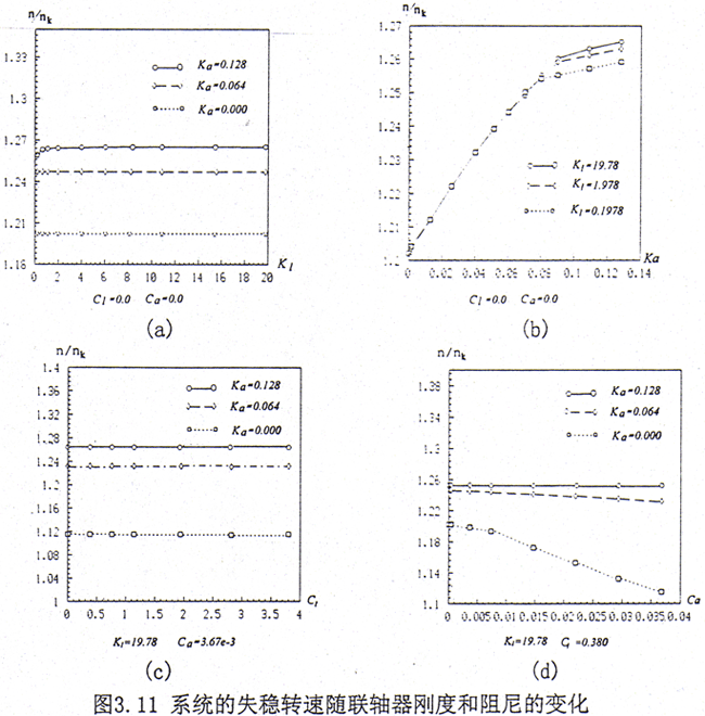 從圖3.11c可見在一定的范圍之內(nèi),齒輪聯(lián)軸器橫向內(nèi)阻尼的變化對系統(tǒng)的失穩(wěn)轉(zhuǎn)速幾乎沒有影響。由圖3.11d可知,隨齒輪聯(lián)軸器轉(zhuǎn)角內(nèi)阻尼的增加失穩(wěn)轉(zhuǎn)速減小,減少的幅度與系統(tǒng)的轉(zhuǎn)角剛度有關(guān),轉(zhuǎn)角剛度取大值時,系統(tǒng)的失穩(wěn)轉(zhuǎn)速變化甚微,而取小值時,則變化明顯。一般而言,對于確定的齒輪聯(lián)軸器類型,如果輪齒間的潤滑充分對中良好,則轉(zhuǎn)角內(nèi)阻尼變化不會太大。所以系統(tǒng)的失穩(wěn)轉(zhuǎn)速也不會有明顯的變化。但當潤滑不充分,齒輪聯(lián)軸器對中不良時,轉(zhuǎn)角內(nèi)阻尼的變化較大,從而會引起系統(tǒng)失穩(wěn)轉(zhuǎn)速生產(chǎn)較大的變化。