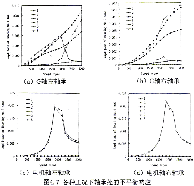 比較圖4.5a和4.6a可見,同樣在G軸的大齒輪上存在不平衡量,單軸和耦合系統(tǒng)所產(chǎn)生的響應(yīng)卻有較大的差別。用單個(gè)G軸計(jì)算,從G軸的左端開始到右軸承不平衡響應(yīng)幅值變化比較平緩,隨后迅速增大,在外伸端達(dá)到最大值;而用耦合系統(tǒng)來計(jì)算,則在G軸的左端振幅最大,比用單個(gè)G軸計(jì)算所得值在同一位置高得多,隨后迅速減小,在G軸的右軸承處振幅最小,之后又迅速增大,在外伸端達(dá)到一極值,但比用單個(gè)G軸所得值小,這一特點(diǎn)表明,耦合后G軸外伸端的不平衡響應(yīng)受到一定程度的抑制;從圖4.6b可知,聯(lián)軸器的不平衡量對(duì)本身的振動(dòng)產(chǎn)生較大的影響,對(duì)G軸左右軸承的影響較小,當(dāng)然這與聯(lián)軸器的不平衡量密切相關(guān),如果聯(lián)軸器的不平衡量較大,則另當(dāng)別論;由圖4.6f可見,在G軸、聯(lián)軸器和電機(jī)軸上同時(shí)存在不平衡量時(shí),在工作轉(zhuǎn)速下,聯(lián)軸器處的響應(yīng)幅值很大,與圖4.6b相比可知,聯(lián)軸器處的振動(dòng)是G軸、聯(lián)軸器本身和電機(jī)軸三處不平衡力綜合作用的反應(yīng),聯(lián)軸器處振動(dòng)過大對(duì)其可靠運(yùn)行帶來不利。另外比較圖4.5和圖4.6可知,電機(jī)軸的不平衡響應(yīng)主要是由電機(jī)軸自身的不平衡造成的,G軸和聯(lián)軸器的不平衡對(duì)其影響很小。從圖4.7可見,僅在G軸上作用不平衡力,當(dāng)轉(zhuǎn)速超過1000(rpm)后,用耦合系統(tǒng)計(jì)算所得G軸軸承上的振幅明顯大于用單個(gè)G軸所得值,而且隨轉(zhuǎn)速增大,變化越明顯。在工作轉(zhuǎn)速下,二軸承處的振幅前者分別是后者的1.60倍和1.66倍,這表明用單個(gè)G軸計(jì)算G軸二側(cè)軸承的不平衡響應(yīng)是不安全的,而且實(shí)際測(cè)量[18]的結(jié)果確實(shí)要比計(jì)算所得的值要大得多。另外,在軸承處的不平衡響應(yīng),只要是用耦合系統(tǒng)進(jìn)行計(jì)算,那么在非共振區(qū)各轉(zhuǎn)子的不平衡只對(duì)本身所所在二個(gè)軸承的振幅起決定作用,而對(duì)另二個(gè)軸承影響不大。這反映了在一般情況下,一側(cè)轉(zhuǎn)子的不平衡所引起的振動(dòng)通過聯(lián)軸器而傳遞到另一側(cè)的振動(dòng)較小,這也正是齒輪聯(lián)軸器被廣泛采用的另一個(gè)優(yōu)點(diǎn)。
