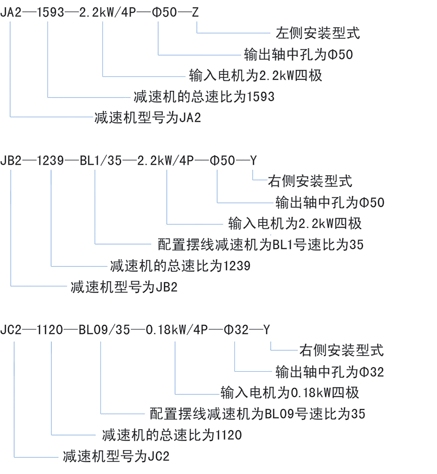 1、型號有: JA—蝸輪蝸桿圓柱齒輪直輸出;