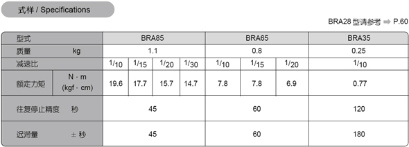 BRA 28·容許軸向負載1 5kgf·容許徑向負載3 0kgf·容許傳遞扭矩3kgf cm·遲滯量±180角秒·減速比1/10·質(zhì)量120g·型式表示僅為BRA28—10